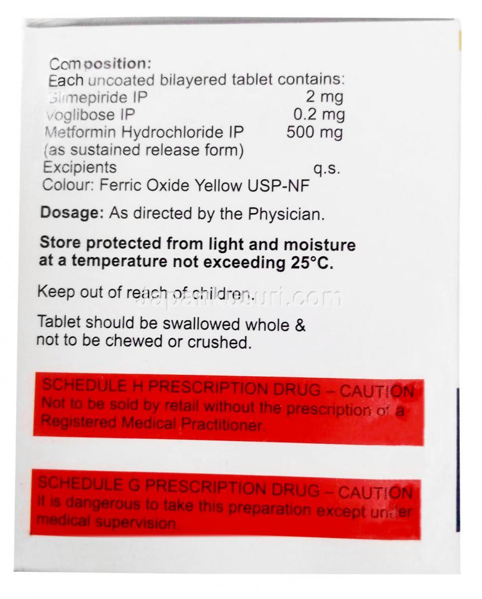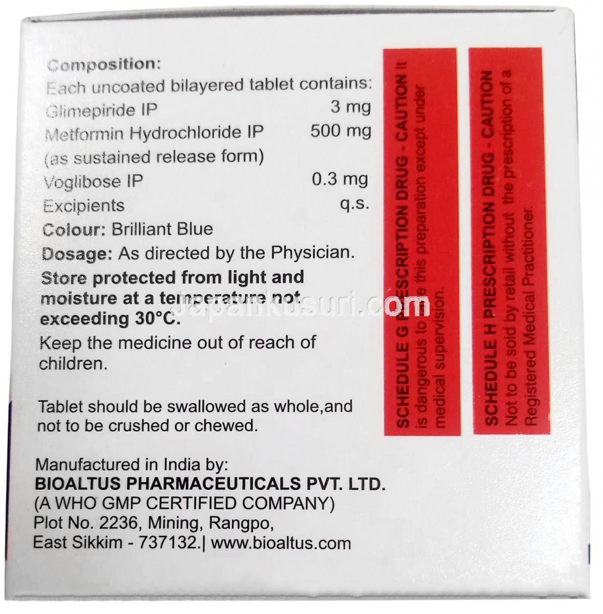 | 含有量 | グリメピリド 1mg/ メトホルミン 500mg/ ボグリボース 0.2mg, グリメピリド 2mg/ メトホルミン 500mg/ ボグリボース 0.2mg, グリメピリド 3mg/ メトホルミン 500mg/ ボグリボース 0.3mg |